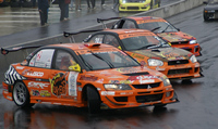 それは何故かというと、4人とも追走が大好きで、しかも最高の舞台での追走となると、「いつもよりくっついていま~す~」てな感じで、必要以上にビタビタの追走を披露してしまいます。 そしてなんと言っても、D1エキシビジョンの他に、Team ORANGEが、海外などで披露している”ドリフトショー”の時間をいただきました。これは、4台の車両でドリフトしながら、シンクロナイズドスイミングのようなショーをやるのです。