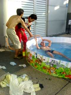 フィニッシュドライバーを努めた青木選手は、レーシングスーツを脱ぎ捨てプールに直行。そこで初めて山野選手と握手。
