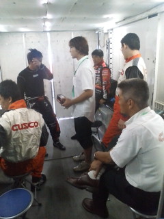 予選一回がまもなくスタートします。アタックドライバーは、佐々木選手です。天候は、今にも降り出しそうな空です。路面は、レコードラインだけ乾いています。非常に難しい予選のミーティングスナップです。