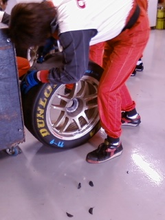 昨日の予選が終わった後のひとコマ。使用したタイムを削りだしたメカニック。削って大丈夫なんですか??実は、タイムアタックした後のクールダウン時、他の車のタイヤカスを拾ってしまうそうです。冷えてしまうとタイヤにくっついてしまい、でこぼこなタイヤへ。それでは走れないのでこうやってカスだけを削ります!