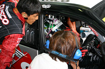マシンに乗り込んだ佐々木選手と、最後の打合せをする山野選手と松田マネージングディレクター