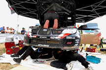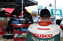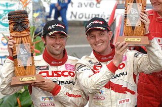 前半ガマンの走り、後半は猛アタック ヘリッジ選手が2位表彰台!! ヘリッジ選手は序盤のSS3、SS4、SS5の1ループ目は、初めてのコースとあって路面コンディションを確認しながらの慎重にドライブ。週前半のテストでもマシンを入念にセッティング、多くの時間を割いていたことからも、意気込みがうかがえる。それと初めてペアリングを組むコ・ドライバーのクリス選手との意志疎通にも不安があり、十分時間をかけていた。SS7、SS8に入ると慎重だったドライビングをシフトアップ。3番タイム、2番タイムとペースアップ。2回目のサービスを終えると、硬いバーンにパウダー状の土が載った路面、しかも所々ウェットにも慣れてきて、トップタイムを叩き出していた田口選手(Evo.IX)を追撃し始めた。すると、とうとうSS11、Leg1最終ステージではトップタイムを叩きだし、3位に浮上した。 |