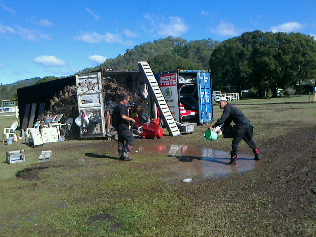豪雨のフィニッシュ翌日に見事な「秋」晴れとなったのですが、クスコレーシングのコンテナの前だけは、昨日の深い水溜まりが!