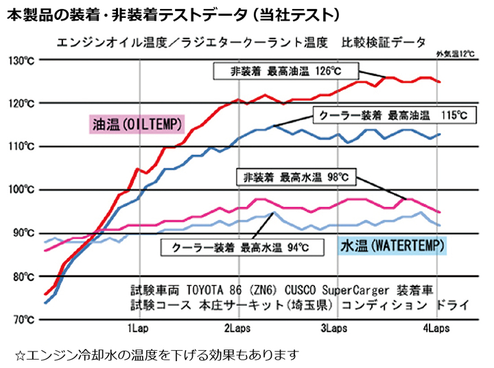 - スポーツ走行では約130℃にも上昇するエンジンオイル温度を大幅にクールダウン