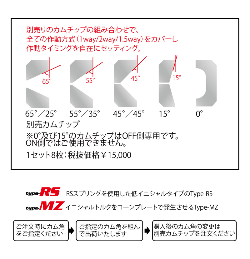 ※ 設定カム角は、 0°・15°・25°・35°・45°・55°・65°です。※ 0°及び15°のカムチップはOFF側専用です。ON側ではご使用できません
