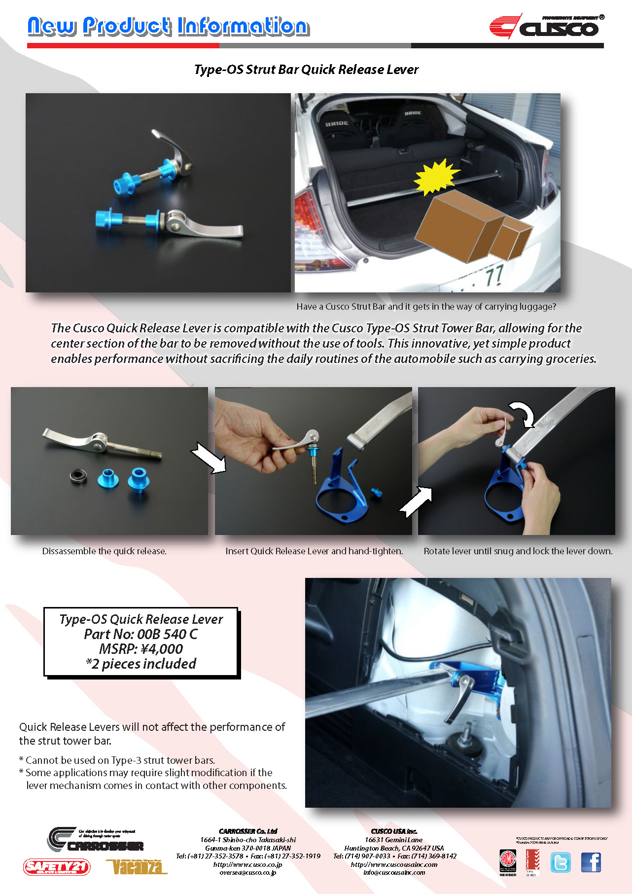 The Cusco Quick Release Lever is compatible with the Cusco Type-OS Strut Tower Bar, allowing for the