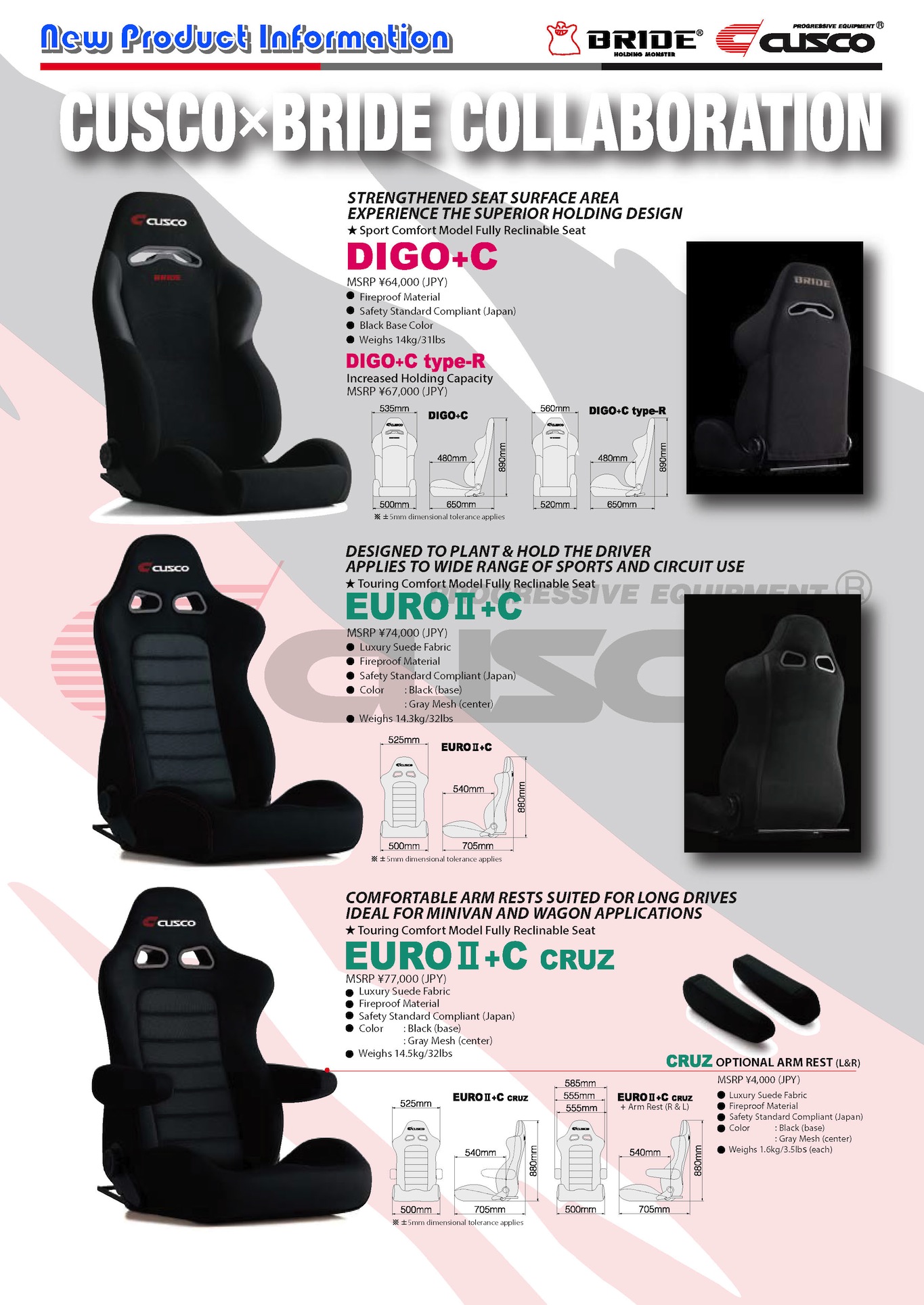 The long awaited CUSCO x BRIDE collaboration seat is finally here. Making its official debut and announcemet of SEMA of 2012, these seats have made its way to the long list of the Cusco product lineup. All Bride seats are hand crafted in Japan and are FIA approved (*most models).