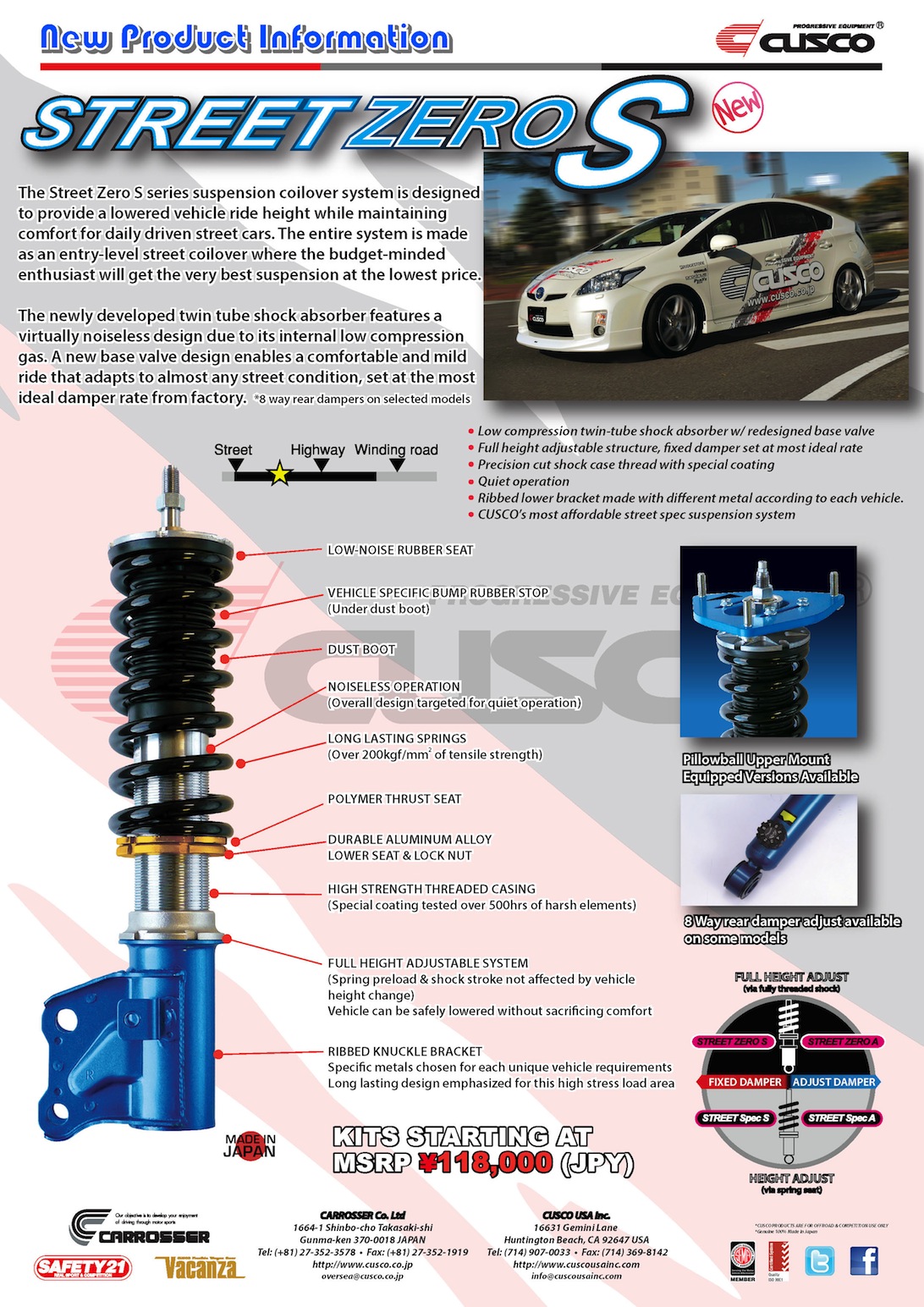 Cusco presents: new street suspension coilovers for the budget minded enthusiast. The Street Spec S and Street ZERO S series are similar to the Spec-A & ZERO-A series except that these feature a fixed damper setting, designed for virtually any street condition. These are the best street coilover suspension system that we offer for the lowest price as 100% high quality made in Japan product.