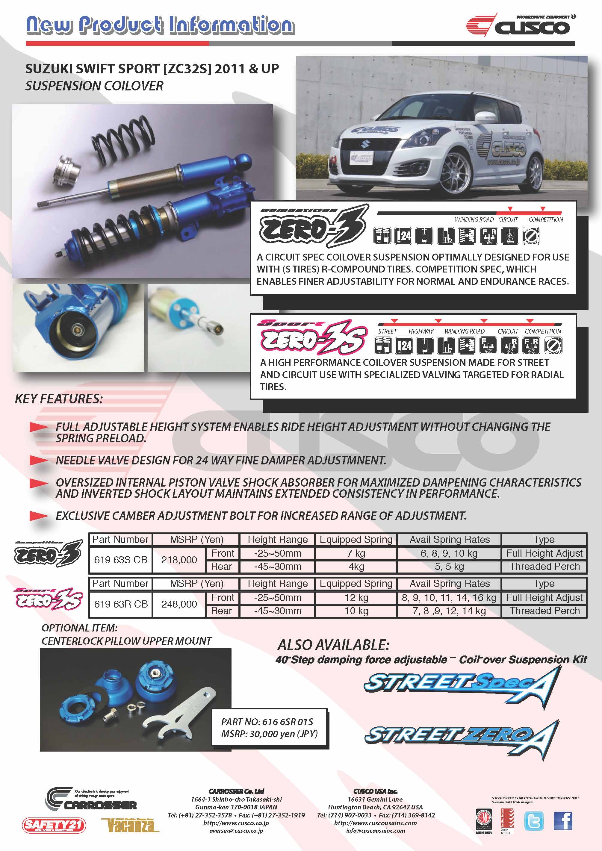 Cusco presents street & competition coilovers for the new 2011 & up Suzuki Swift Sport (ZC32S).
