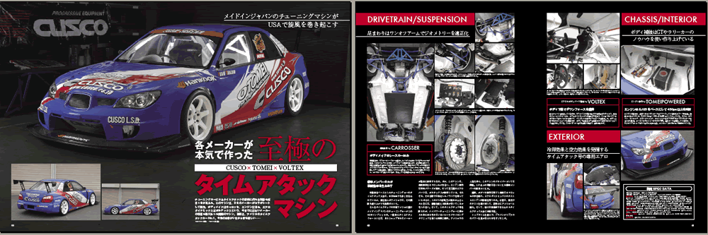 We must to apologize that it’s been a while since we’ve released the time attack project on May. However we want to update this project’s information here. Let me go back the date to let you know how we are doing regarding to this activities. We, CUSCO and TOMEI POWERED have discussed many many times to create the time attack car together….. It was really tough and long way to get there. And we reach the point to ship the car to US finally. It’s been considered together so much about the schedule for the day to develop, to build, and to test it. Originally, this project started as the one of our marketing promotion for the JDM market in US to appeal our names and to offer the tuning trend. CUSCO takes charge of the chassis and the suspension design and development, TOMEI POWERED takes charge of the engine design and development, and VOLTEX takes charge of the aerodynamics as the specialist. |