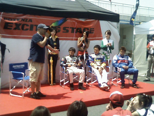 トークショーがはじまりました。司会はピストン西沢さんで飯田章さん細川真也さんとクスコGTドライバーの山野哲也さんです レースの裏話などいろいろ普段聞けないはなしをしています