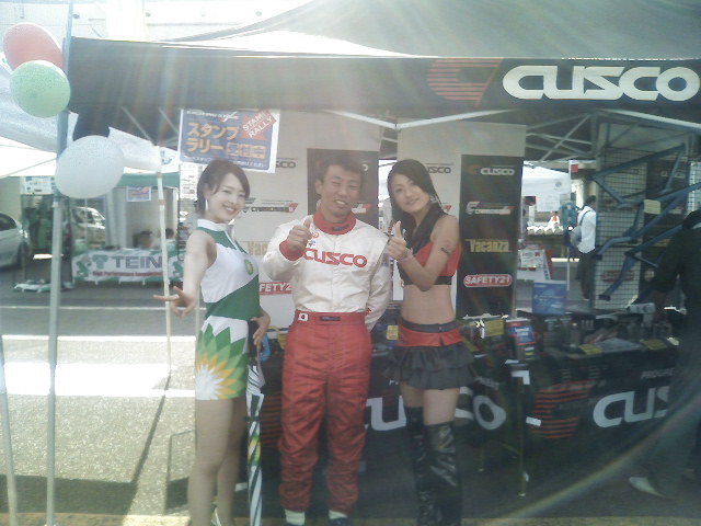 走行終了後にクスコサーキットレディーの中野さゆりさんとBPカストロールギャルの平岩めぐみさんと一枚撮影しました
