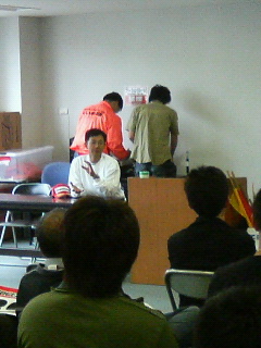 皆さん、おはようございます。ここ十勝インターナショナルスピードウェイでは、BS北海道地区コクピット・タイヤ館合同走行会のブリーフィング中です。本日の「クスコ・インプレッサ」のドライバーは全日本ラリー選手権に「クスコ・ランサー」で参戦中の「星野博」選手です。BSタイヤの開発にも携わる星野選手、只今タイヤの特性について講習中!