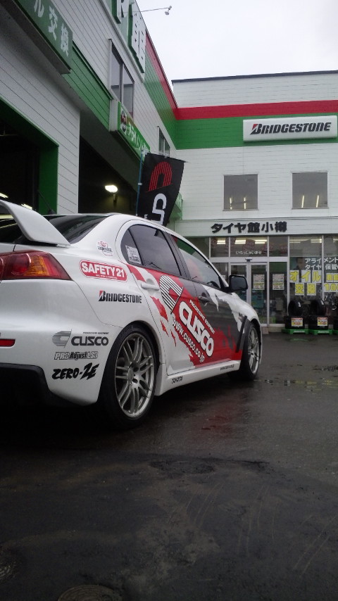 皆さん、こんにちは!こちらはタイヤ館小樽です。只今「春一番!CUSCO・Vacanza大商談会!」開催中です。本日の体感試乗デモカーはCZ4Aエボ10です! サスキット、ボディ補強、駆動系、など是非!クスコを体感してください。
