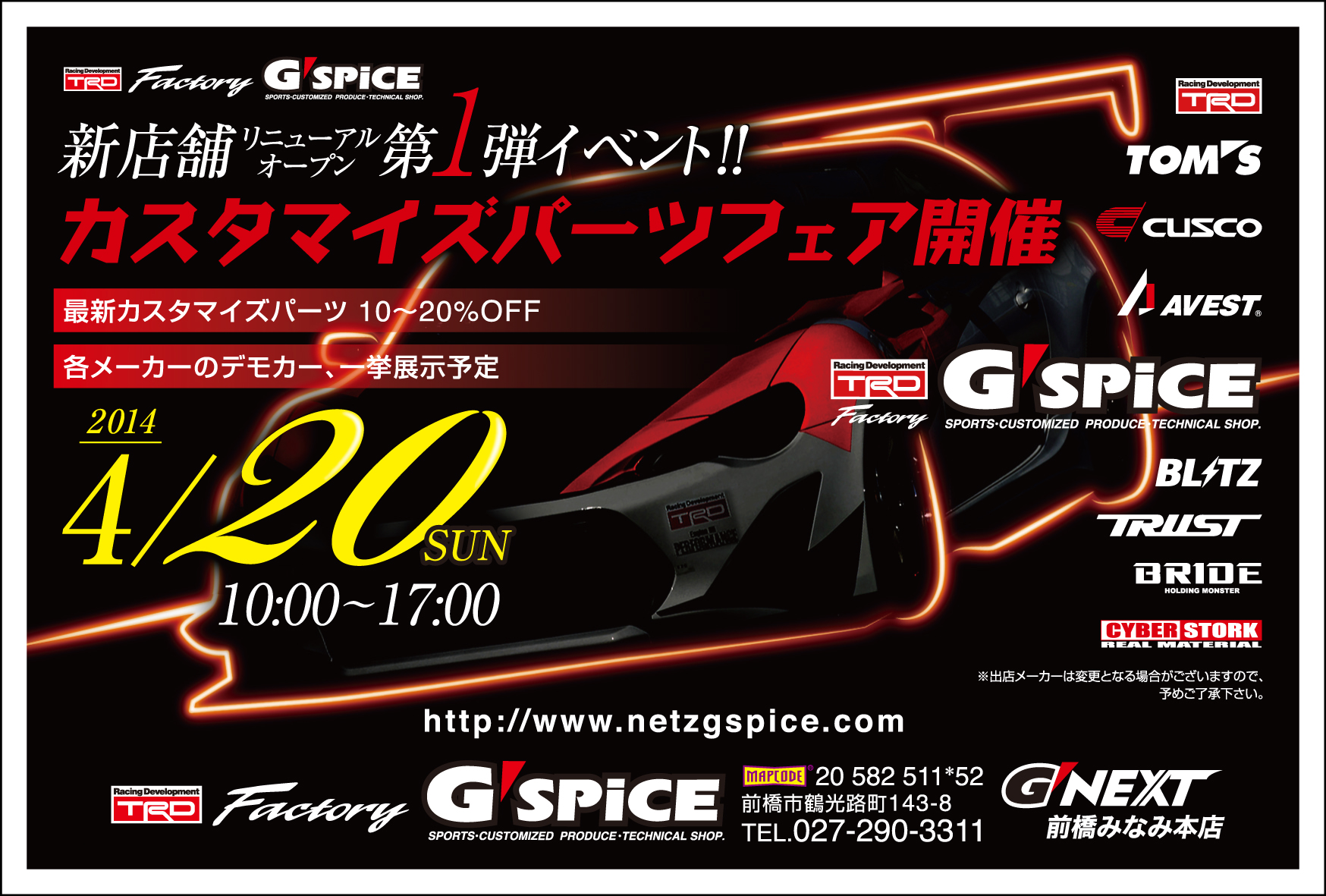 | |4/20 前橋市 G'NEXT 前橋みなみ本店『G'spice 2014 カスタマイズパーツフェア』に出店します| |