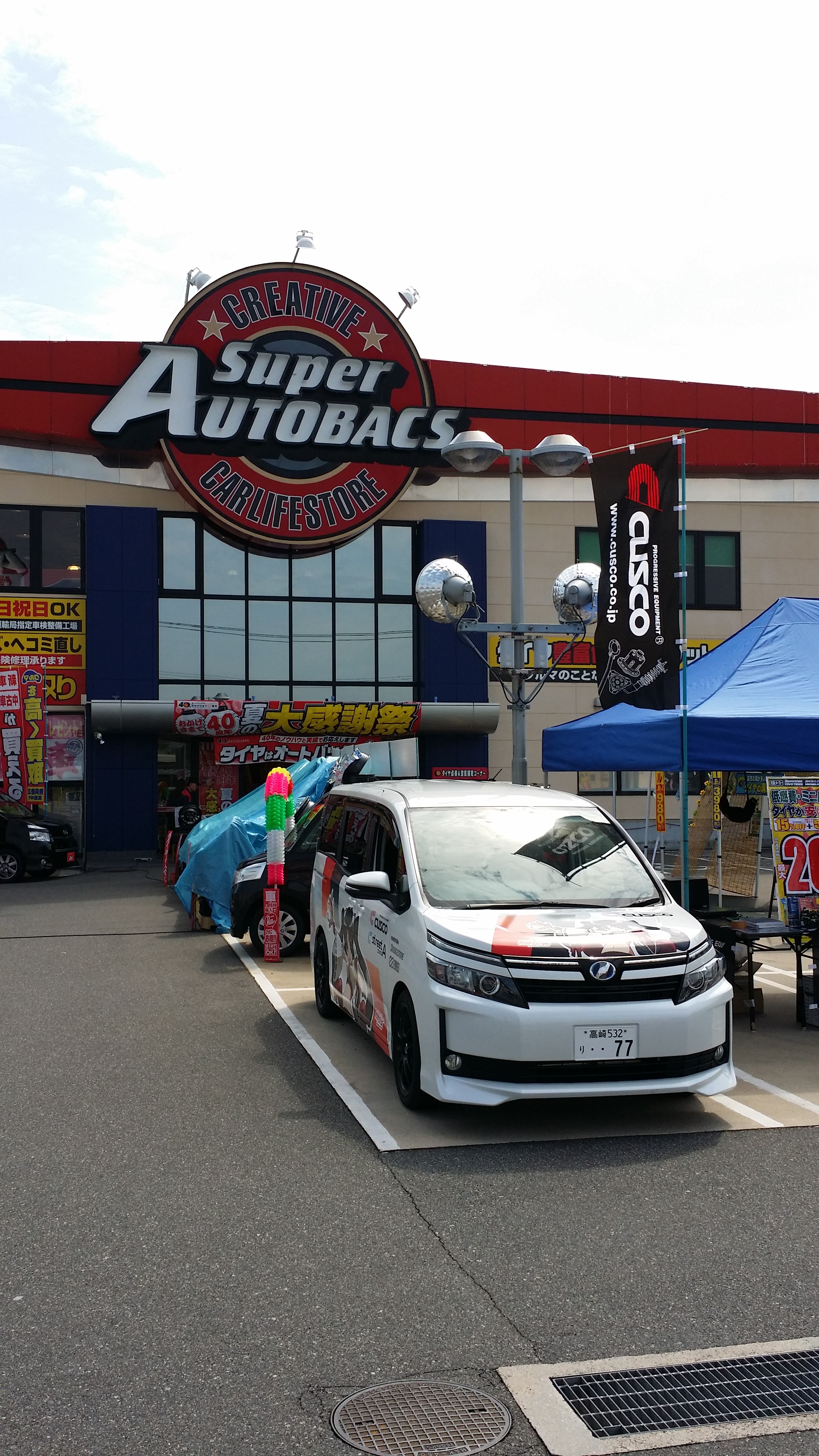 皆さん、おはようございます。まもなくスーパーオートバックス広島商工センター開店です。本日、明日の「クスコ車高調フェアー」デモカーのヴォクシーハイブリッドとともにお待ちしています。