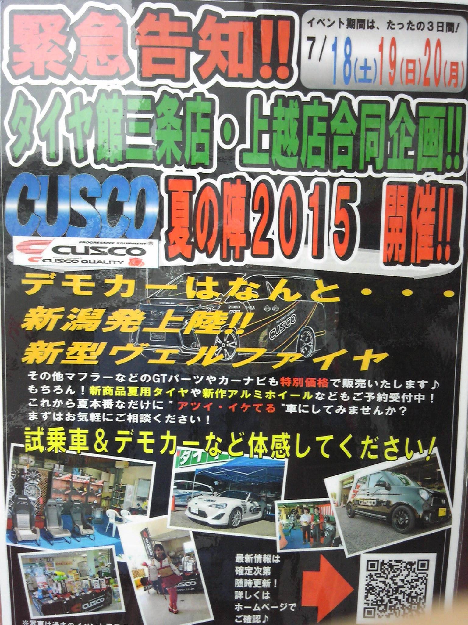 タイヤ館三条店、上越店合同企画 クスコ夏の陣2015が本日より開催されます。