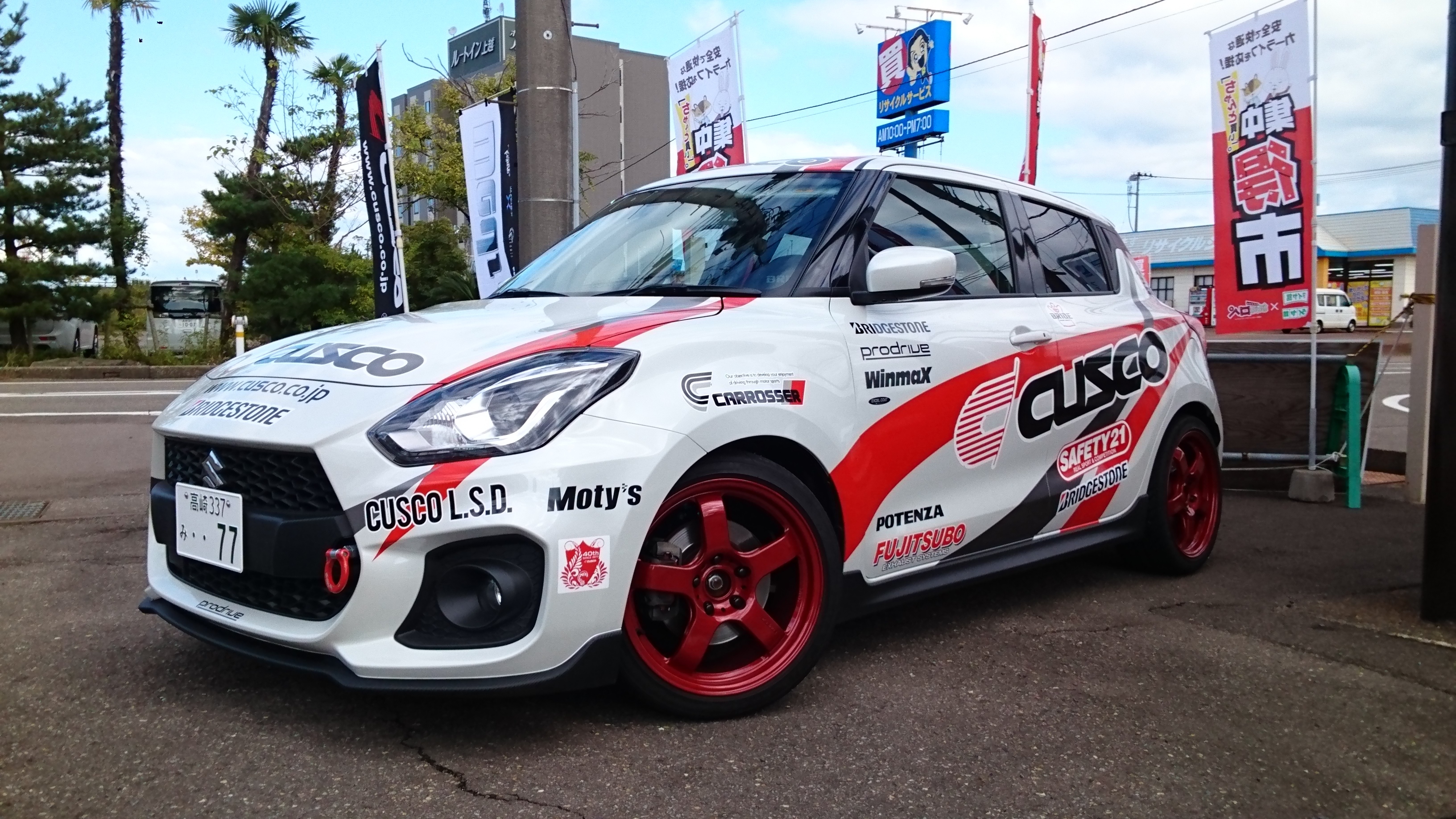 CUSCOスイフトスポーツZC33Sは、全長調整式・減衰力40調整の車高調「street ZERO A」が装着。タワーバー・スタビライザー・ボディ補強にLSD・ロールバーが装着。