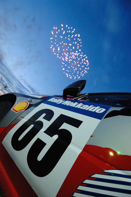 [7]は、ラリー会場では珍しい海外車と全日本車が並んだショット。 [8]、車の向こうにはお祭りの花火が綺麗です。この写真をクリックすると花火の1粒ずつが見られます。