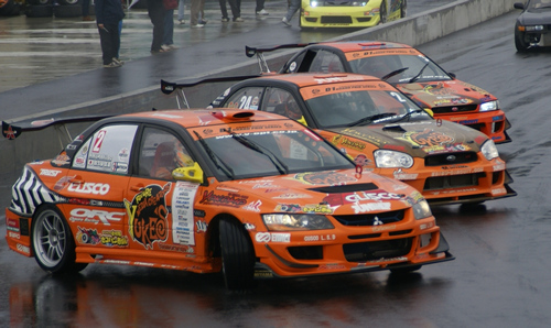 それは何故かというと、4人とも追走が大好きで、しかも最高の舞台での追走となると、「いつもよりくっついていま~す~」てな感じで、必要以上にビタビタの追走を披露してしまいます。 そしてなんと言っても、D1エキシビジョンの他に、Team ORANGEが、海外などで披露している”ドリフトショー”の時間をいただきました。これは、4台の車両でドリフトしながら、シンクロナイズドスイミングのようなショーをやるのです。
