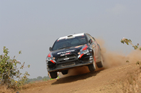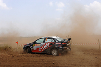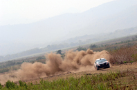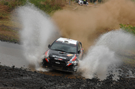 ドライバー同様メカニックも汗だく。 SS1のジャンプポイントを飛ぶ。 激走中の柳澤選手。