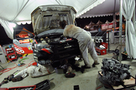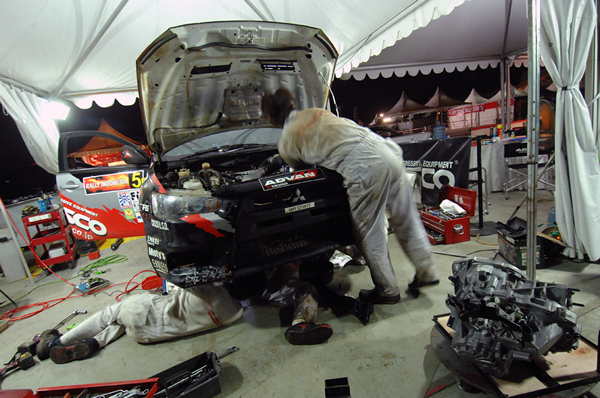 深夜まで修復をするメカニック達。 コースはこんな埃舞う道が続く。 撮影ヘリに追尾されているよう。