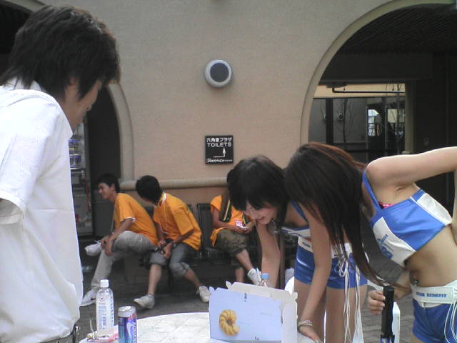 こちらは、セレモニアルスタート会場の舞台裏です。炎天下で、各選手が到着するまで、ちょっとした休息タイムです。僅かな時間でも、サービスに励む小野沢チーフメカニックです。レースクイーンの女性に、ミスタードーナツをサービス中です。ミスタードーナツを、すぐに買いに行ける程、今回は、街の中からのスタートです。