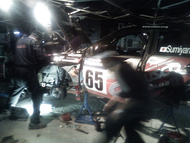 左フロントタイヤをバーストしたため左側を集中的修復しています、 残り20分になりましたがクスコチームのメカニックなら綺麗に修復してしまいます