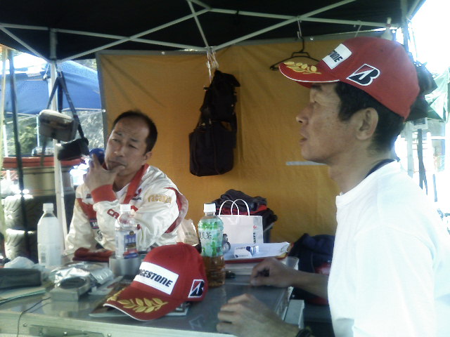 テント内でオートスポーツの取材を受ける二人ですが、どこかくらいです。
