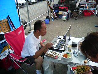 焼きそばを目の前にしてパソコンを見っています。