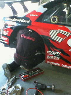 合同テスト二日目、今日は、昨日の改修した部分の確認後、セッティングの適正化を行い、タイヤテストを行います。リア車高の変更を、迅速に行っているのは、全日本ラリーに主に行っている、熊崎メカニックです。