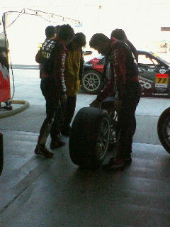 二日目、一回目の合同テスト終了後、タイヤを顔(表面)を見て、マッチングするタイヤを話し合っています。5月の富士の気温その他諸々を考えて、GT第三戦富士で使用するタイアを検討します。