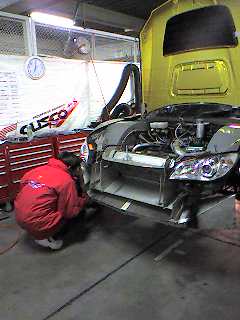 今日の午後の走行は、一旦はピットアウトしたのですが、エンジンのシステムに破損が生じ、走行出来ませんでした。また、破損した部分が想定外の場所だったので、急遽キャロッセが有る、群馬から部品を社員がかついで、電車で来る事となりました。