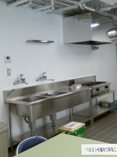 一階と二階に一部屋ずつ、キッチン、トイレ三個、そしてシャワー室!普通に住める装備がととのってます。写真はキッチン…というか厨房かな?