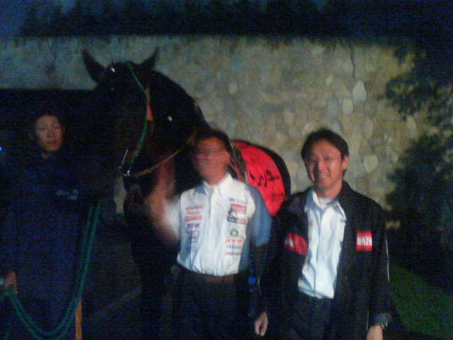 パーティ前にバンエイ競馬の馬の前で記念撮影