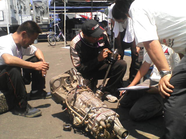 ミッション交換の作業を終了させ、水を飲み一息つくと、早速ミッション交換の作業性を高めるための話し合いが始まりました。しかし、エンジンの上に座り下からの熱に燻製状態になった石原メカは、まだ給水、放心状態です。おつかれさま。