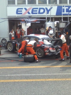 朝のフリー走行は、決勝のシュミレーションを行います。岡山国際サーキットは、ピットが狭いので手前にピット作業をしているクルマがあると、通常の形で停止出来ません。その為斜めに停止してピット作業をする事になります