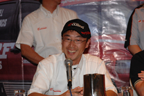 今や、記者会見常連のヤナギ。「Ah・・・、この汗は冷や汗ではアリマセーン」 |