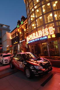 | ジョホールバルの夜景をバックにラリー車がスタート |
