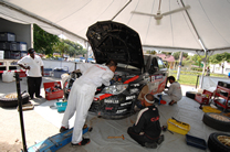 | 限られた時間でのサービスタイムでは、各コーナー+エンジンルーム担当が黙々と作業をこなす |