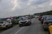 観戦者の路駐が続く中を走るラリー車。海外ラリーの郊外ステージ周辺ではよく見られる光景 |