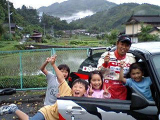 レッキ後、地元の水清谷小学校にゼッケン1から6番までの選手(勝田・石田正史・大庭・奴田原・炭山・田口選手)が表敬訪問しました。 子供たちは、ラリー車と選手を間近にして、大喜びです。
