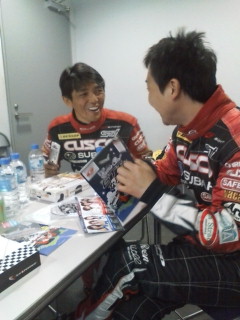 予選2回目に向かって、和んでいるドライバー二人です。二人の笑顔の原因は、佐々木選手の手元に有ります。わかりますか?