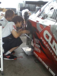 決勝に向けて、メカニックは各部を慎重に、メンテナンスをしています。アライメントの確認している小野沢チーフメカからは、雨ならば勝つぞオーラが出ています。