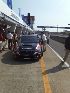 筑波サーキットの本コースでは、パーツ体感同乗走行が行われています。クスコの試乗車は、GRBインプレッサとランサー エボ10です。