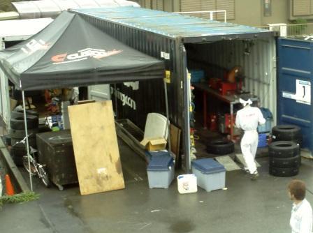 【機材の積み込みが行われている間にメンテナンス中のラリーカー】
