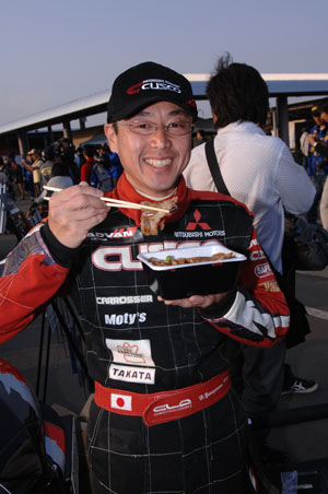 ファンからの差し入れの豚ドンを頂いている柳沢選手、陸別でお待ちしています。