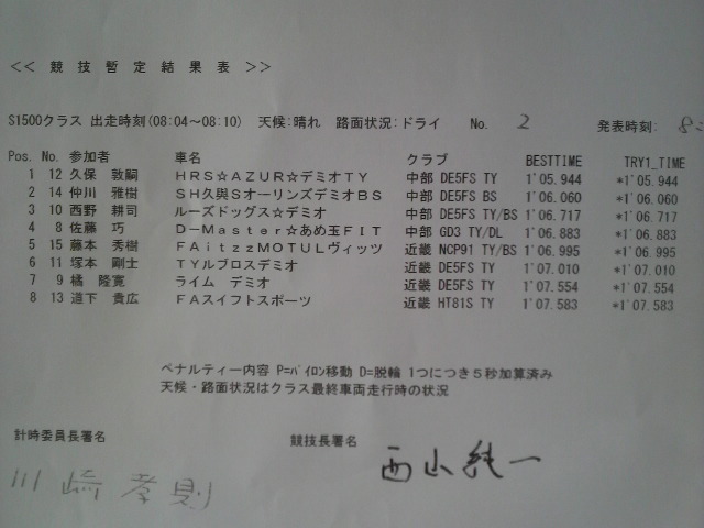 JAFカップジムカーナS1500クラス第1ヒート暫定リザルト