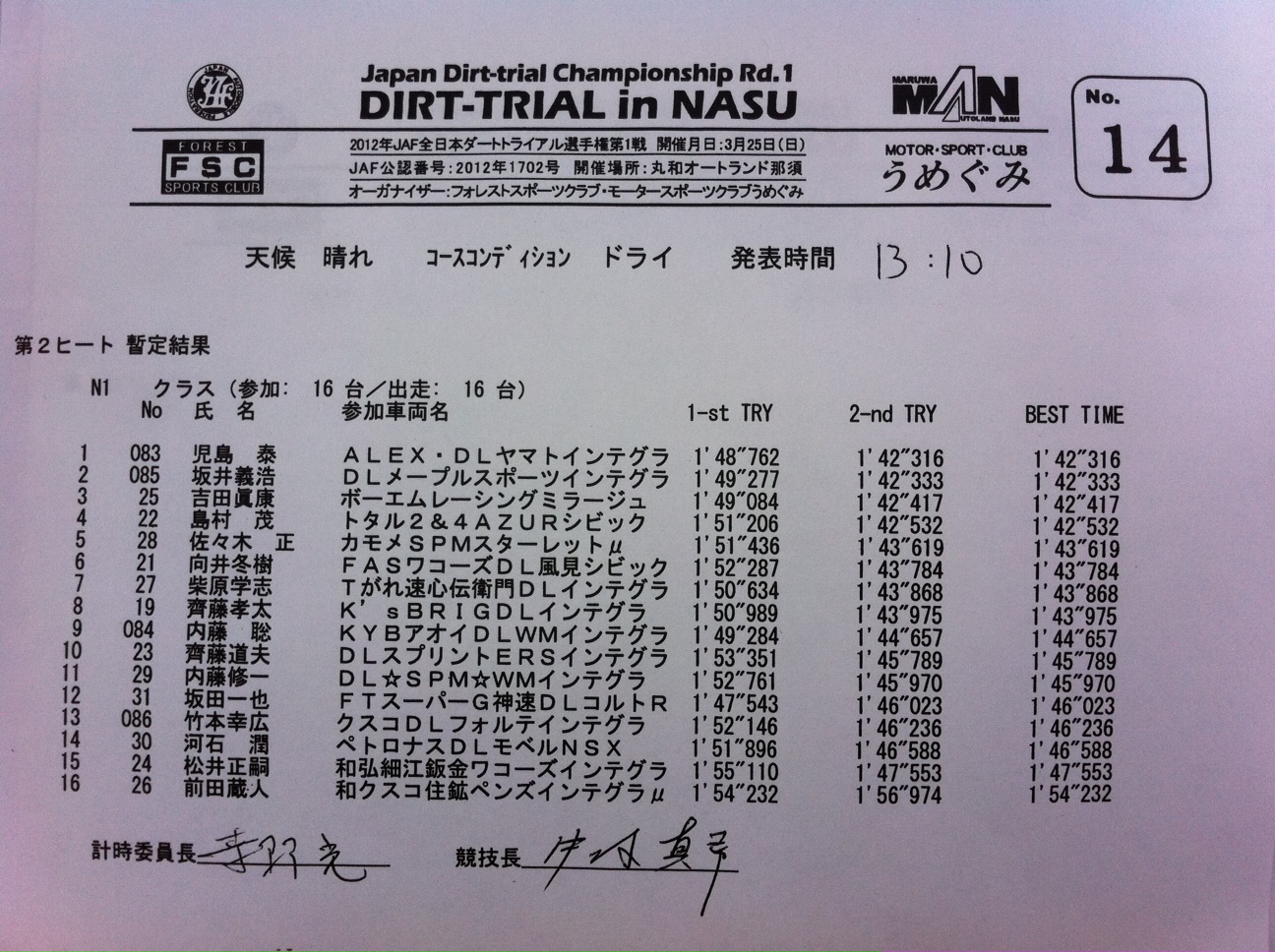 > 全日本ダートラ丸和 N1クラス第2ヒート暫定結果