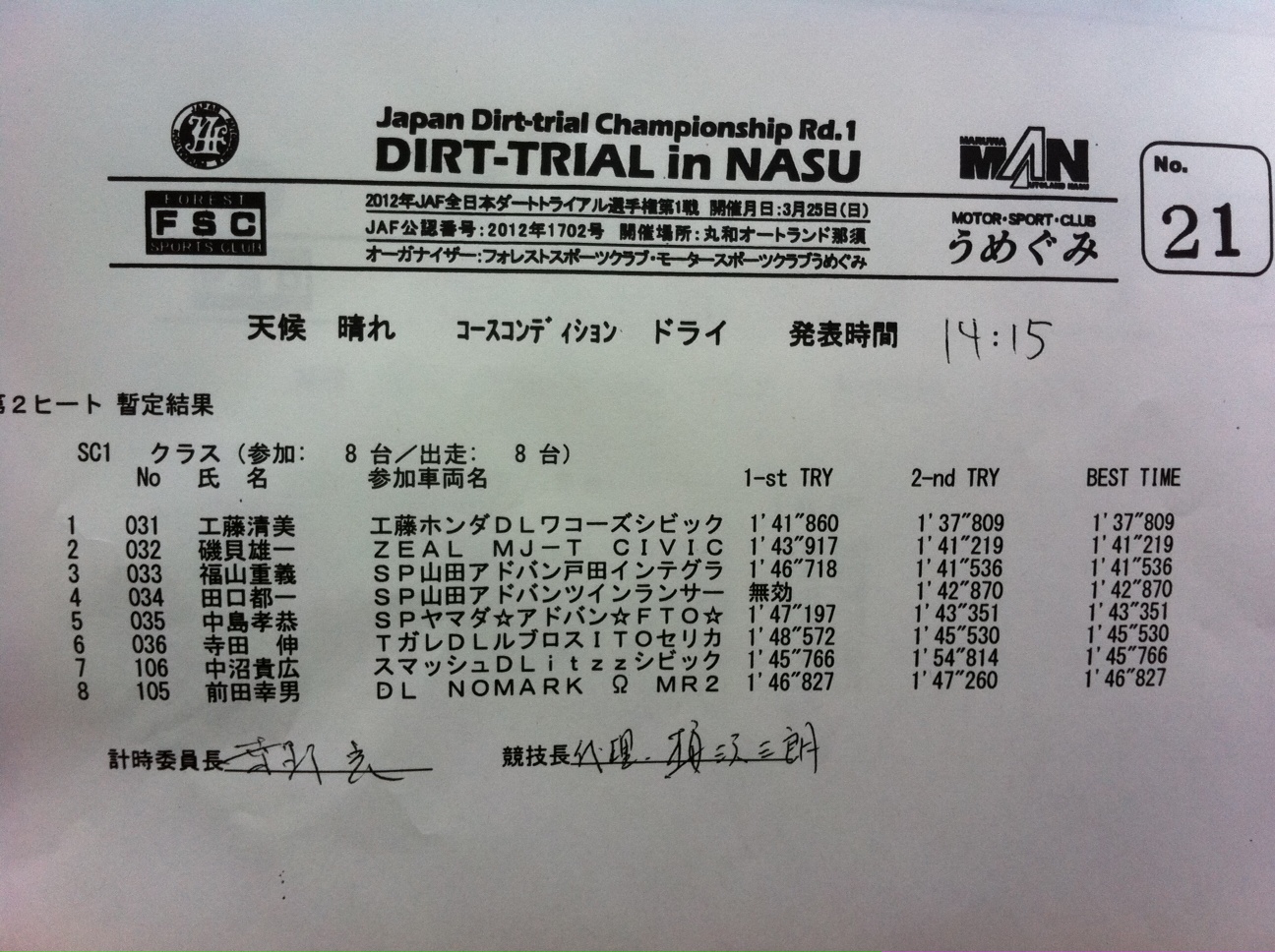 > 全日本ダートラ丸和 SC1クラス第2ヒート暫定結果